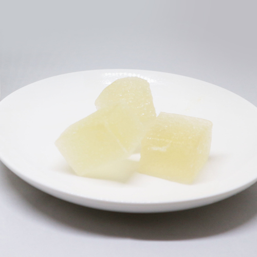 寒天は海藻から作られた食材で、低カロリーかつ食物繊維が豊富で健康にも良いとされています。当社の寒天氷もちは、寒天を溶かして水や砂糖、色素などを加えて固め、信州産果実を混ぜたもので、サクッとした食感も特徴の一つです。