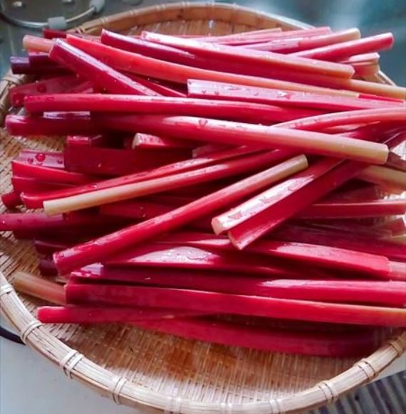 ルビールバーブは、鮮やかな赤色をした酸味の強い野菜で、パイやタルト、ジャムなどのデザートによく使われます。素材そのものの味を活かしたシンプルな仕上がりになっています。