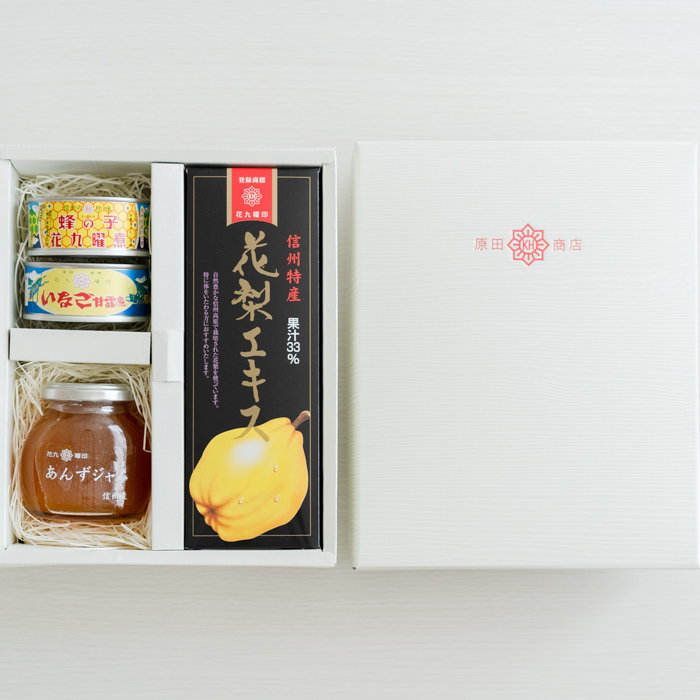 かりんエキス(630g)、蜂の子花九曜煮(65g)、いなご甘露煮(45g)、あんずジャム(180g)